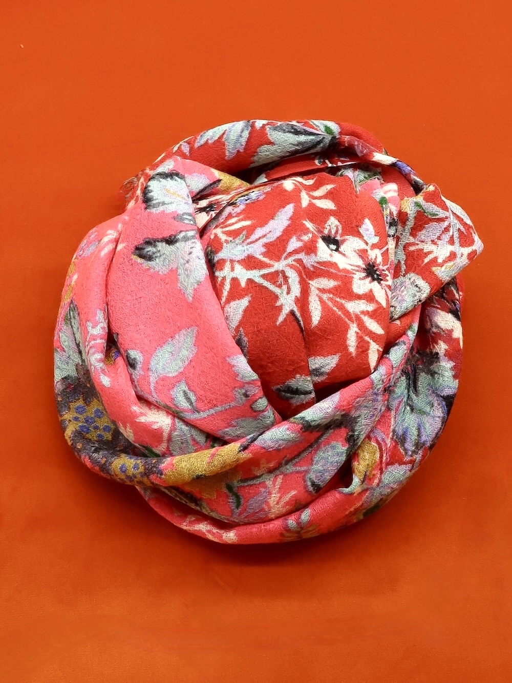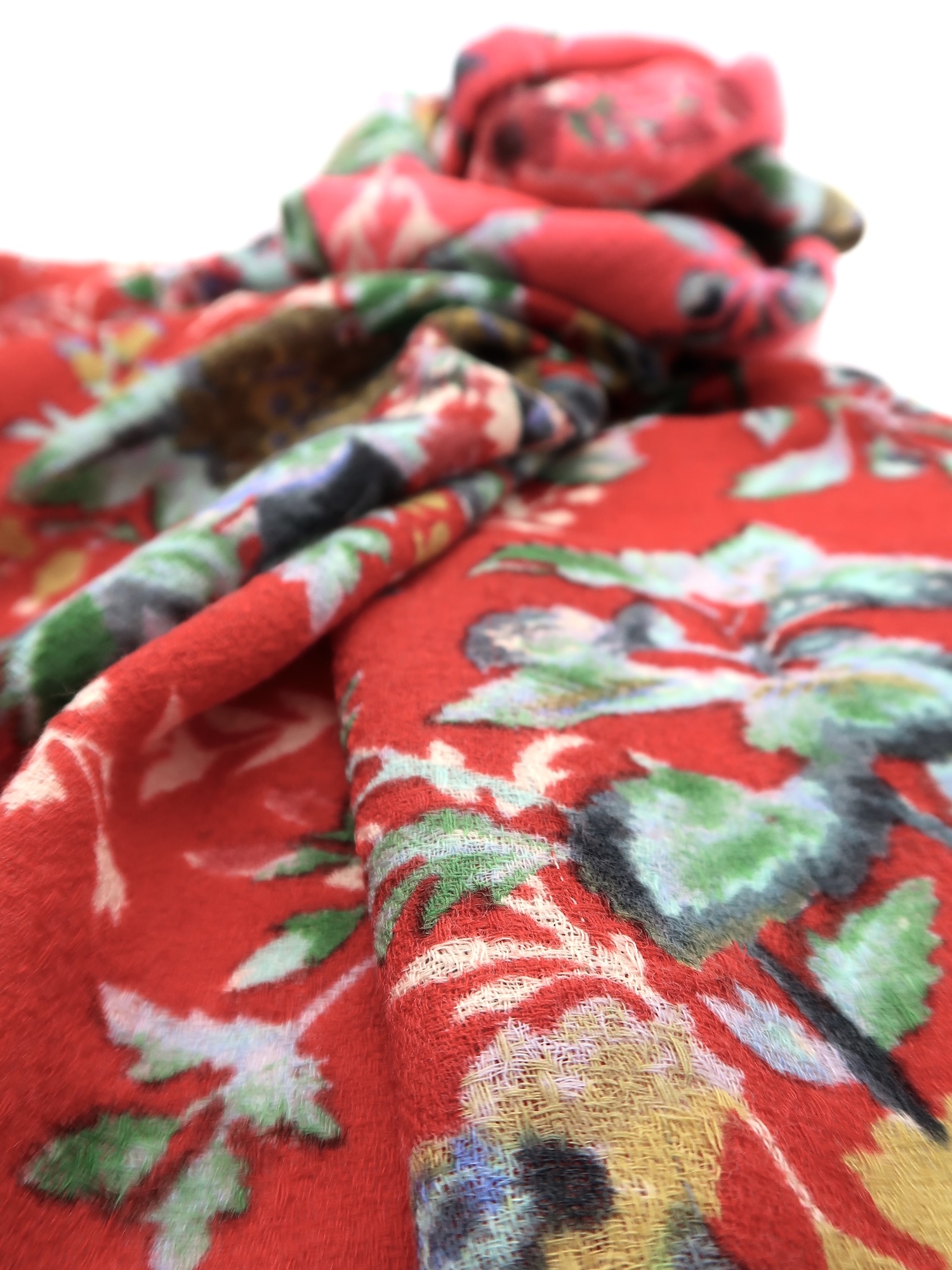 Aus feinster Wolle handbedruckt, hat FLEUR ein klassisches florales Motiv, welches alljährlich neu interpretiert wird.
