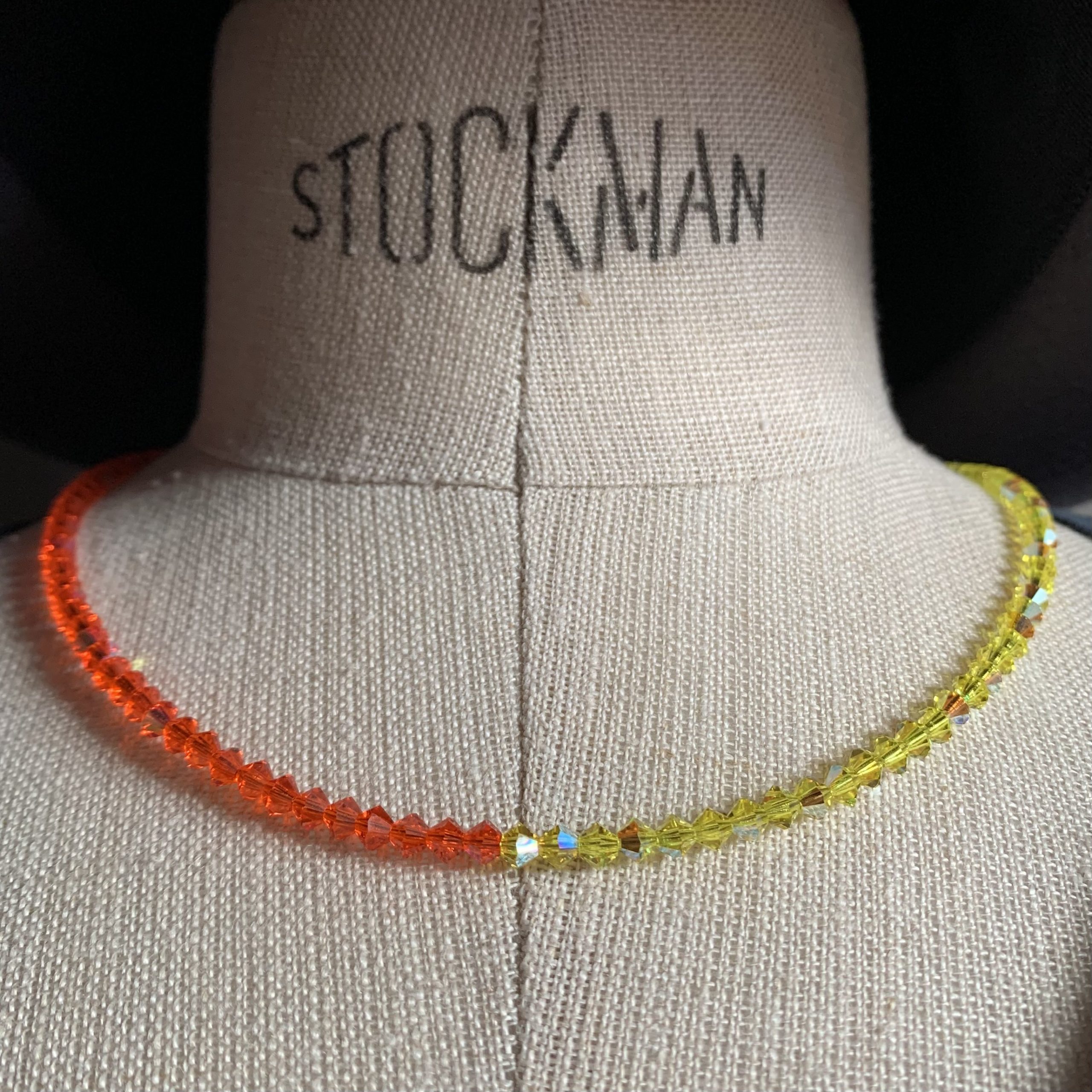 Zur einen Hälfte glitzernd zitronengelb und orange zur anderen Hälfte, ist diese Kette ein farbenfroher Akzent für Strand, Party und elegante Anlässe.