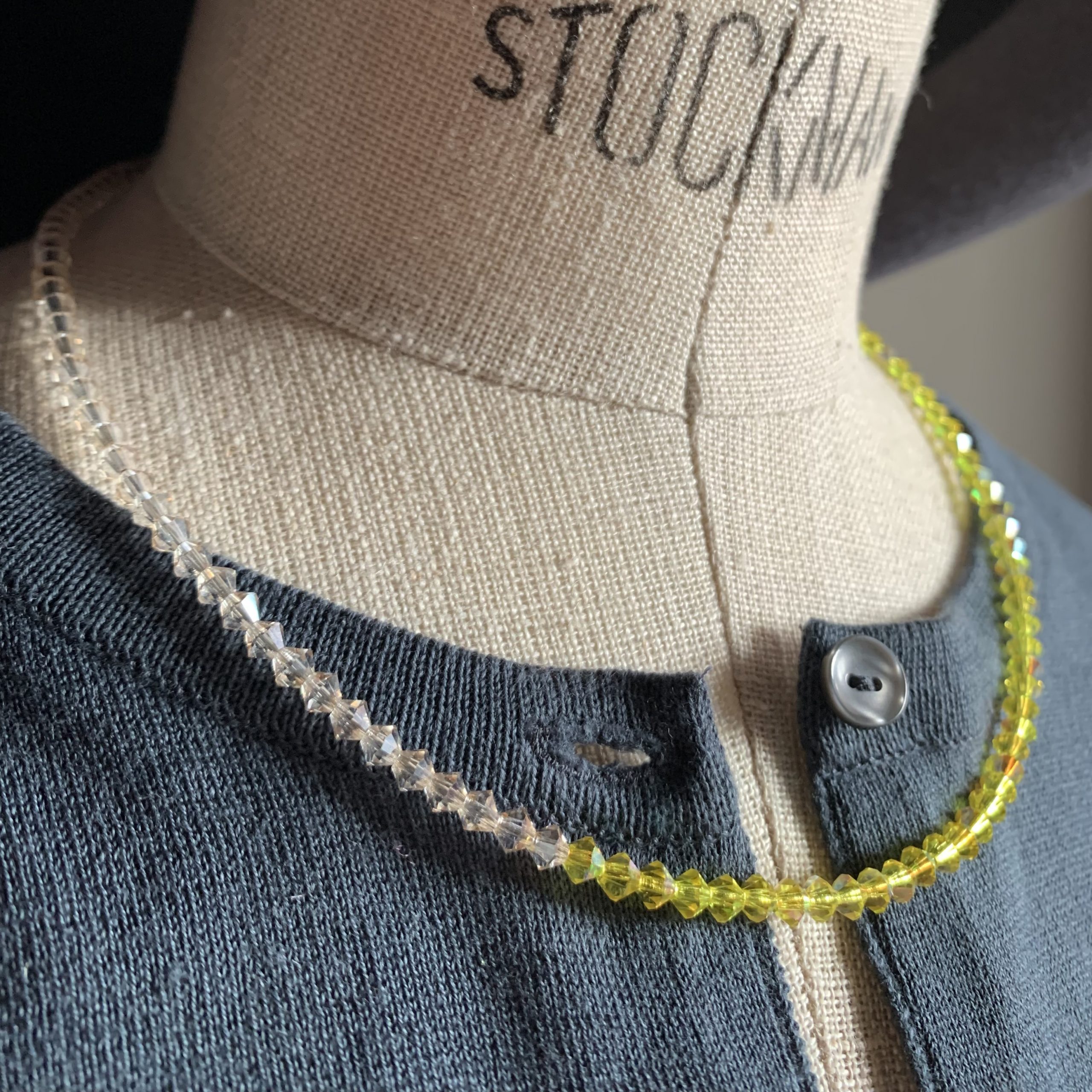 Dem hellen Hautton perfekt angepasst zur einen Hälfte und glitzernd zitronenfarben zur anderen Hälfte, ist diese Kette ein cooles Accessoire für Strand, Party und elegante Anlässe.