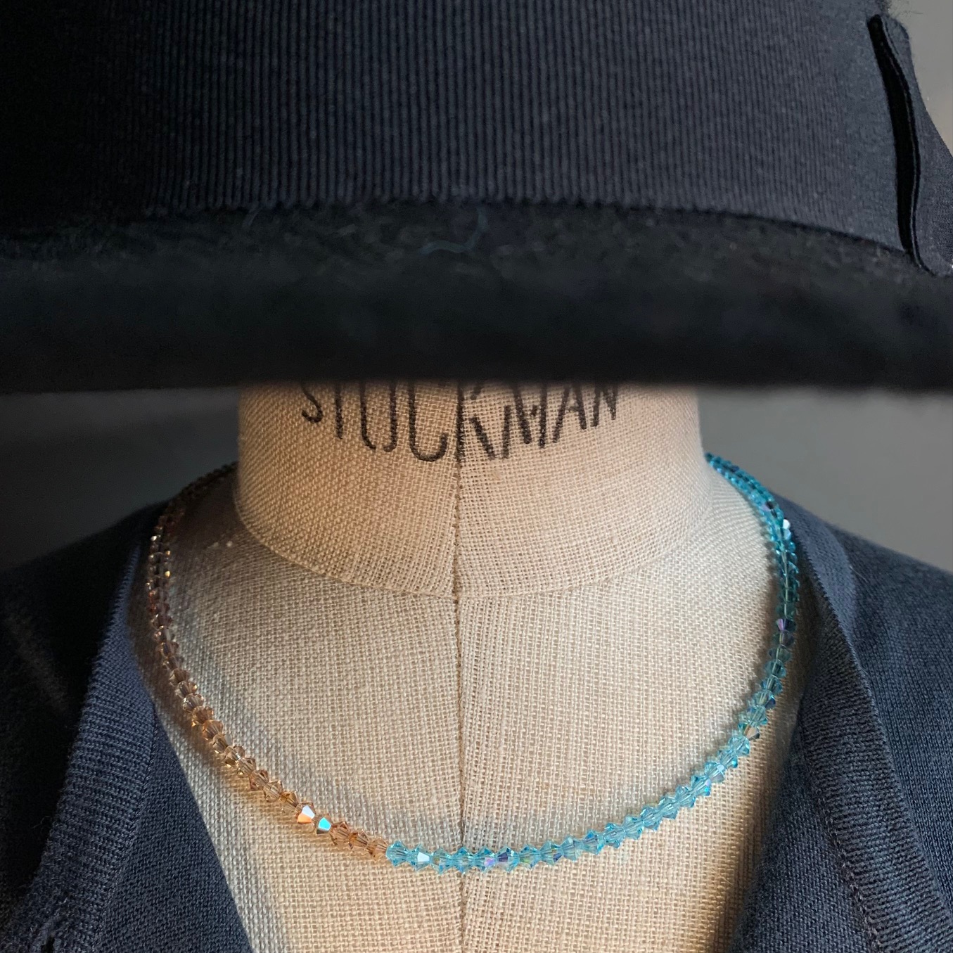 Einem gesonnten Hautton angepasst zur einen Hälfte und blau kristallin zur anderen Hälfte, ist diese Kette ein schöner Akzent.