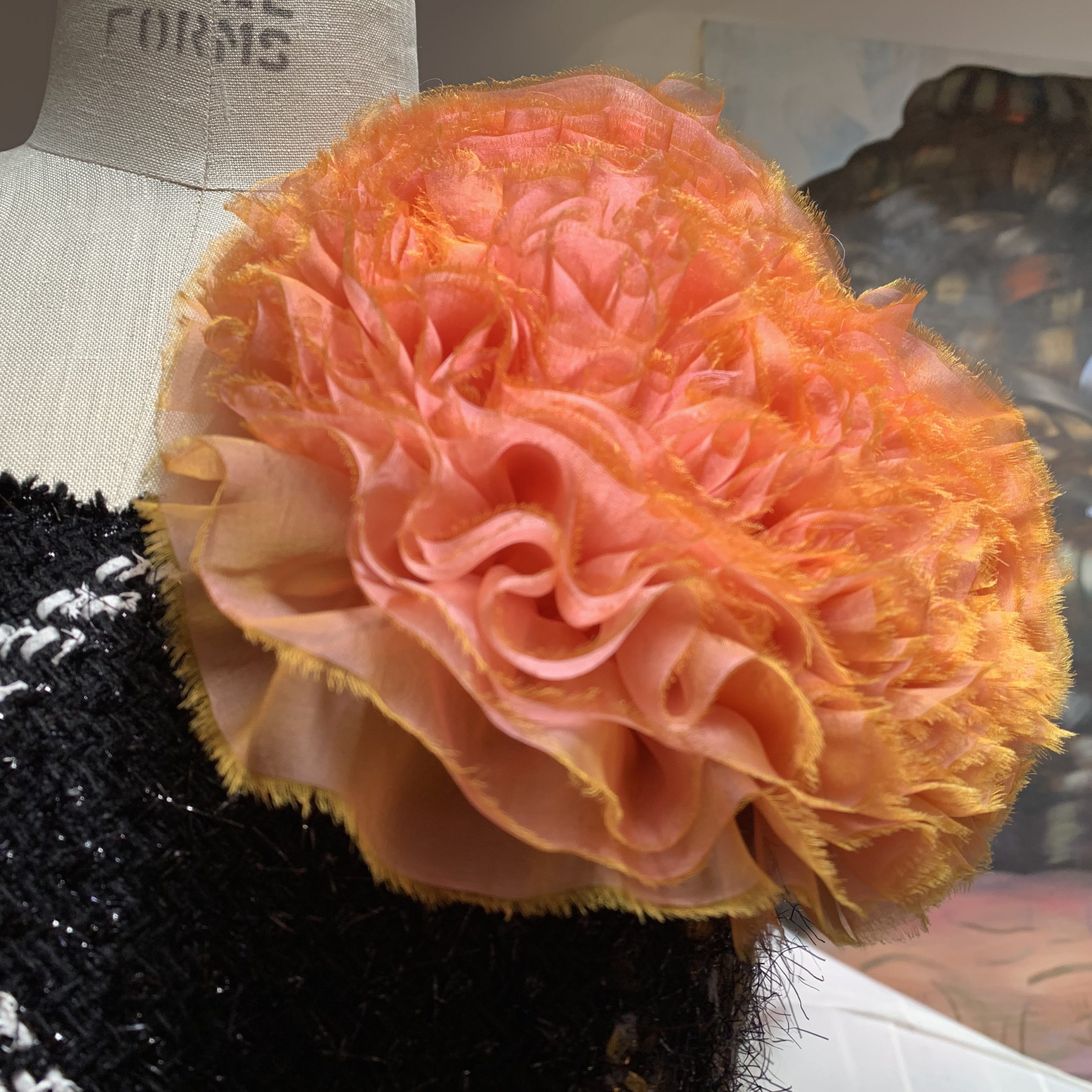 Die satte Farbe der changierenden Seide und die feinen Rüschen machen diese Brosche zu einem textilen Schmuckstück. Ob Bühne oder Ball, dieses Accessoire zieht die Blicke auf sich.