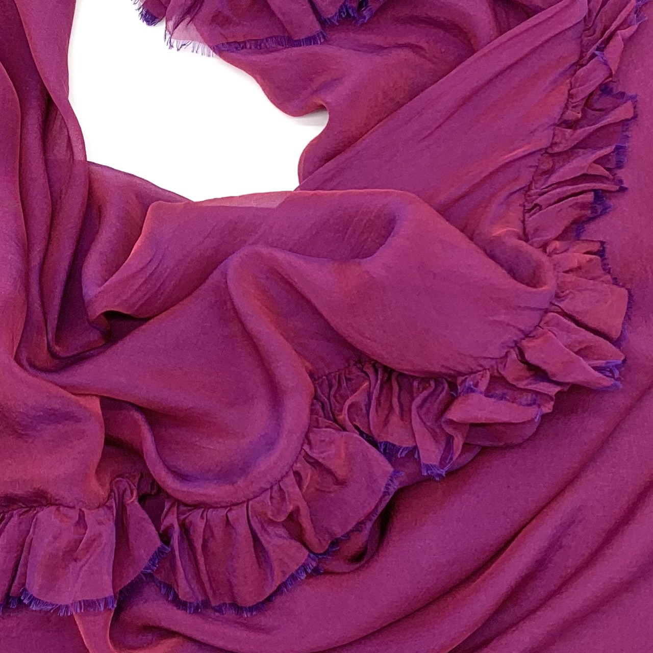 Ein Seidentuch, welches gleich einem Make Up das Gesicht umspielt. Die satte Farbe der changierenden Seide und die feinen Rüschen machen dieses Tuch zu einem textilen Schmuckstück.