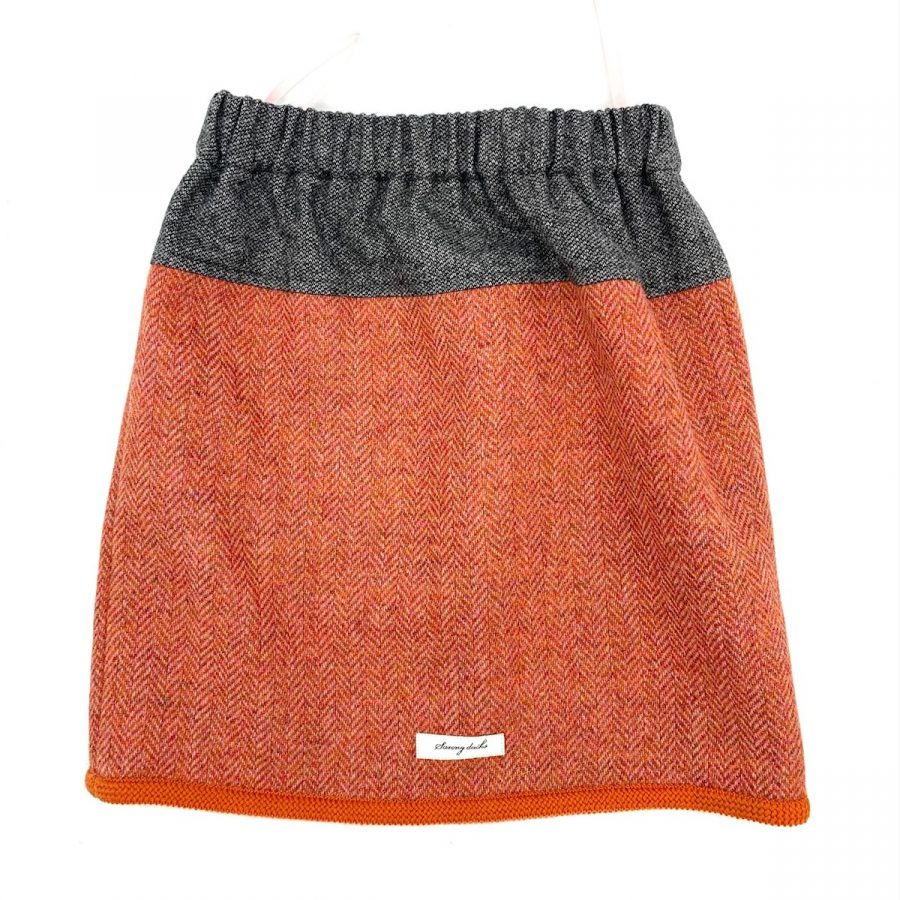 Dieses Röckchen aus wärmendem Tweed soll am besten über Strumpfhose oder Hose getragen werden als wärmende Schicht für ausgedehntes Spiel auch auf kühleren Böden.