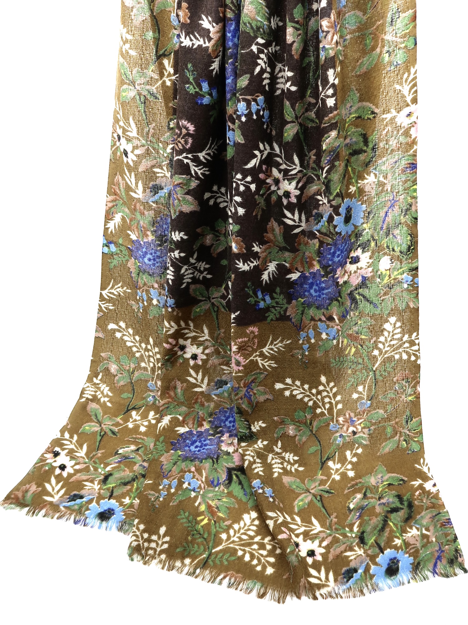 Aus feinster Wolle handbedruckt, hat FLEUR ein klassisches florales Motiv, welches alljährlich neu interpretiert wird.